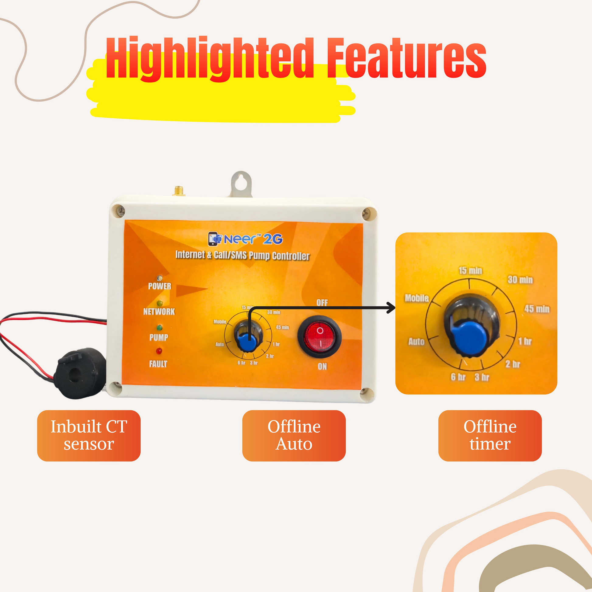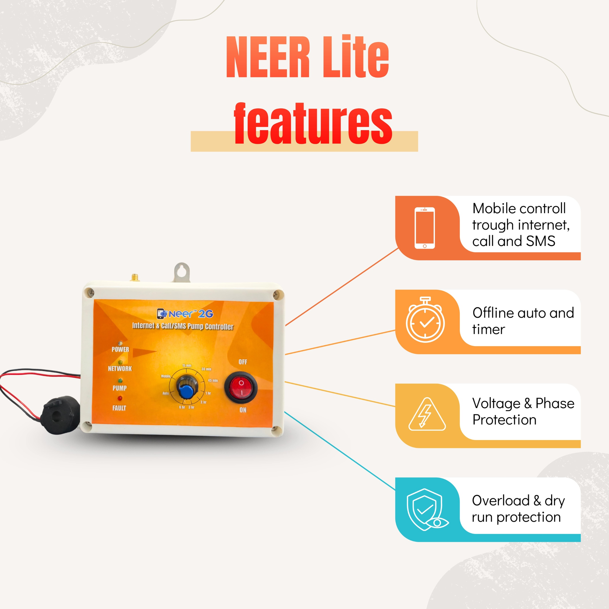 यह उत्पाद 1 साल के डेटा रिचार्ज के साथ इनबिल्ट एयरटेल सिम कार्ड के साथ आता है, जो निर्बाध कनेक्टिविटी सुनिश्चित करता है। इसे 3 चरण में 50 एचपी तक की क्षमता वाले सबमर्सिबल, मोनो ब्लॉक और ओपन वेल पंप सहित पंप प्रकारों की एक विस्तृत श्रृंखला को संभालने के लिए डिज़ाइन किया गया है। इसके अतिरिक्त, यह 1 चरण में 10 एचपी तक के सबमर्सिबल मोटर स्टार्टर को नियंत्रित कर सकता है।